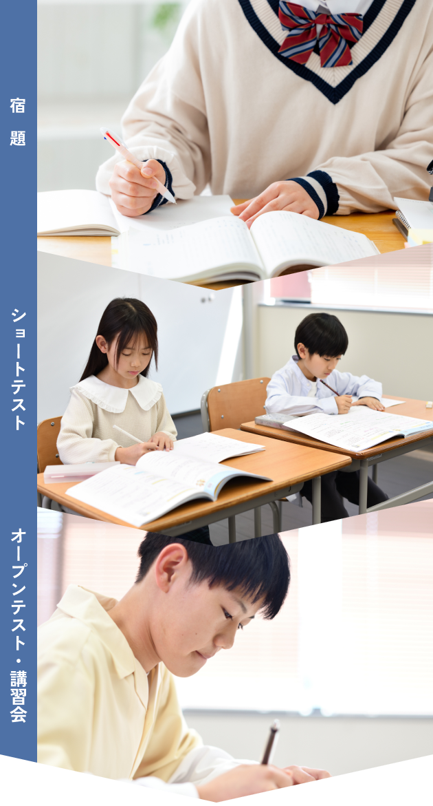 宿題、小テスト、オープンテスト、講習会を通じて、理解度を確認し、確実に定着。