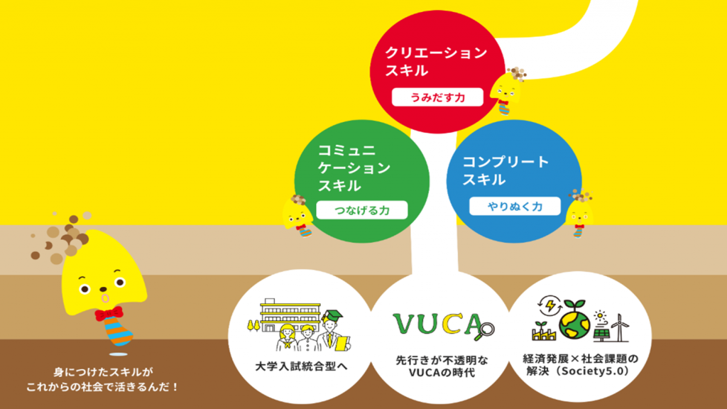 AI(人工知能)と共存する社会で必要な力として、これまで行ってきた”答えのある課題を解決する”だけではなく、”自分らしいやり方で答えを作り、仲間と共にそれを実現していく”ことが求められます。