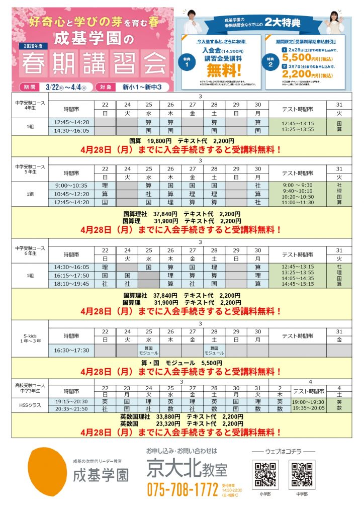 4月28日(火)までに入会手続きを完了された方は、入会金(14,300円)および春期講習会の受講料がどちらも無料となります !