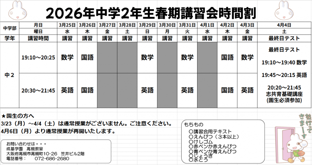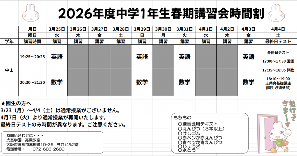 - 3月からの授業内容をフォロー! 成基学園では3月から新年度授業を開始していますが、この講習では3月既習内容を凝縮して復習します。今から始める方も、通塾生との差を気にせずスタートできます。