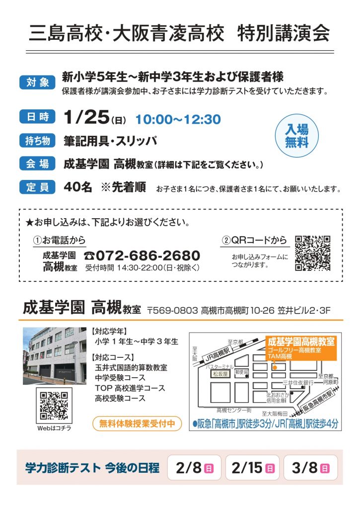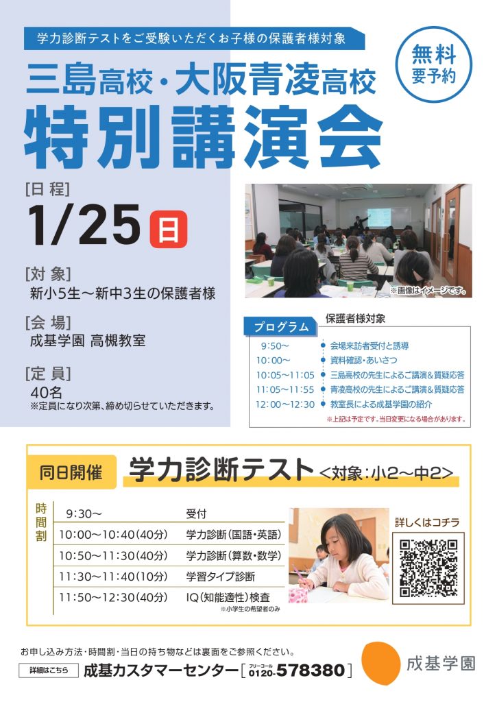 成基学園高槻教室ではこのたび、三島高校・大阪青凌高校の先生方をお招きした特別講演会を開催します。